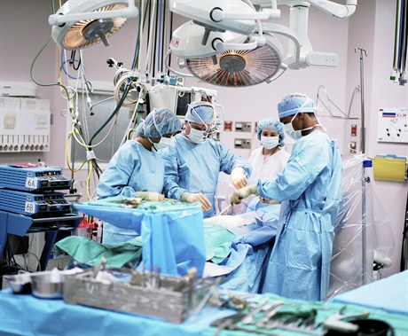 • Las luces del quirófano están sobre la mesa para proporcionar una luz brillante y sin sombras durante la cirugía.